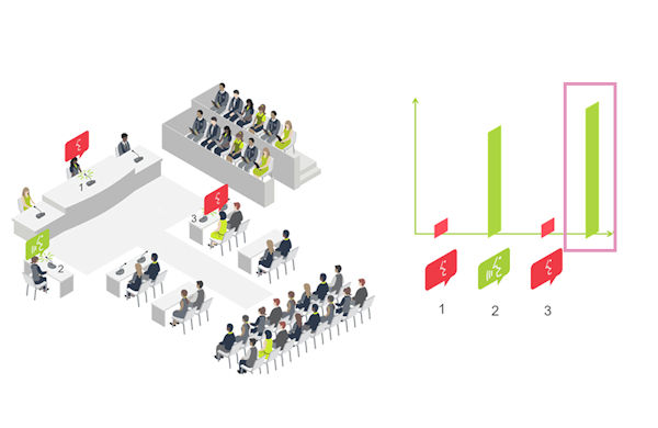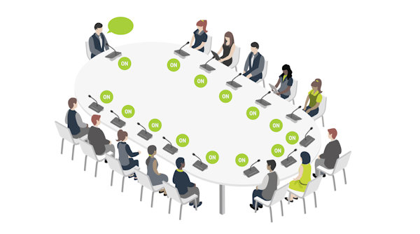 委員会会議室には30台のD-Cernoマイクユニットを導入。発言するマイクの台数が増えた場合でも、全体の出力ボリュームを自動で均一に保つ「ゲインシェアリング」という制御方式を採用しています。発言者の人数や話者が変わっても、システム全体の音量が過剰にならないよう自動で調整されるため、ハウリングやノイズのリスクを低減し、常に安定した音声環境を提供します。