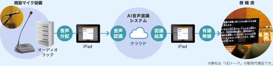 既設のマイク設備にAI音声認識システムを繋げるだけの簡単設定で、字幕をリアルタイムに表示することができます。